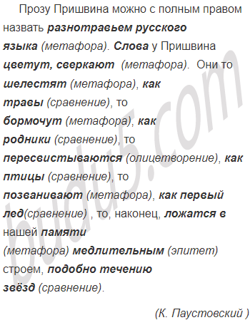 Прозу Пришвина можно с полным правом назвать разнотравьем русского языка. Слова у Пришвина цветут, сверкают. Они то шелестят, как травы, то бормочут, как родники, то пересвистываются, как птицы, то позванивают, как первый лед, то, наконец, ложатся в нашей памяти медлительным строем, подобно течению звёзд.