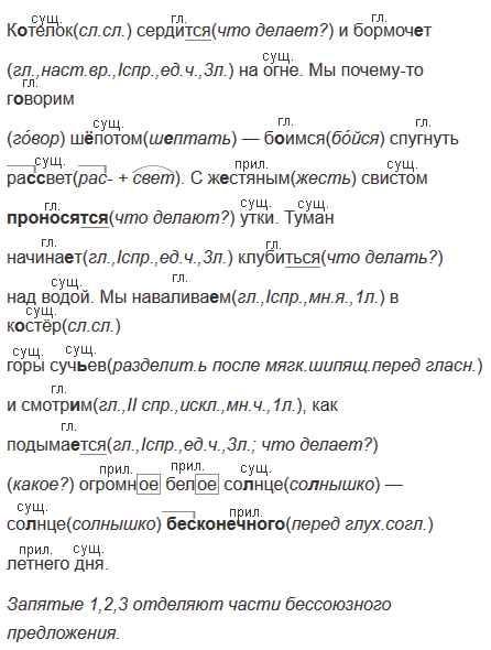 К..телок сердит(?)ся и бормоч..т на огне. Мы почему-то г..ворим ш..потом — б..имся спугнуть р..(с, сс)вет. С ж..стяным свистом проносят(?)ся утки. Туман начина..т клубит(?)ся над водой. Мы навалива..м в к..стёр горы суч(?)ев и смотр..м, как подыма..т(?)ся огромн.. бел.. со(?)нце — со(?)нце бе(е, з)конечного летнего дня. (По К. Паустовскому)